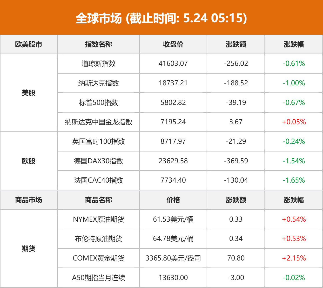 美股市场:据央视新闻,当地时间5月23日,因美国总统特朗普威胁对欧盟和苹果公司征收新关税,美国股市当日收盘下跌。道指、标普四连跌。截至当天收盘,标普500指数收跌39.19点,跌幅0.67%,报5802.82点。道琼斯工业平均指数收跌256.02点,跌幅0.61%,报41603.07点。纳斯达克综合指数收跌188.53点,跌幅1.00%,报18737.21点。本周,标普累跌2.61%,纳指累跌2.47%,道指累跌2.47%。
