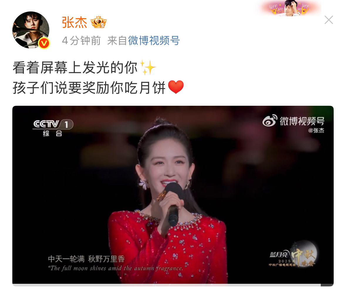 张杰也在期间发文向谢娜送去祝贺,直言看着屏幕上发光的你(谢娜),孩子们说要奖励你吃月饼。