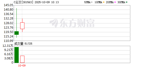 C云汉(301563)上市首日上涨332.59%,换手率达81.95%,成交额为14.29亿元。