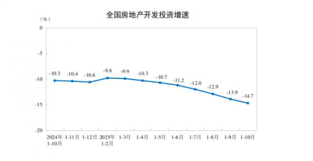 财联社 11 月 14 日电,国家统计局数据显示,1 — 10 月份,全国房地产开发投资 73563 亿元,同比下降 14.7%;其中,住宅投资 56595 亿元,下降 13.8%。1 — 10 月份,新建商品房销售面积 71982 万平方米,同比下降 6.8%;其中住宅销售面积下降 7.0%。新建商品房销售额 69017 亿元生讯网,下降 9.6%;其中住宅销售额下降 9.4%。10 月末,商品房待售面积 75606 万平方米,比 9 月末减少 322 万平方米。其中,住宅待售面积减少 292 万平方米。